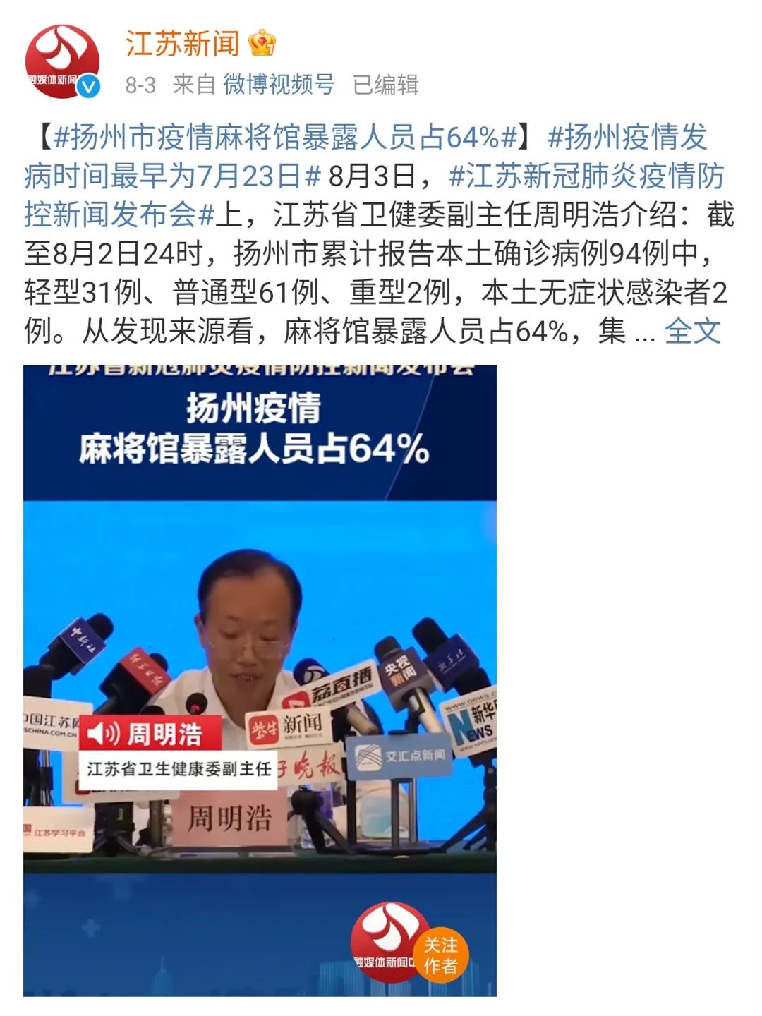 据江苏省卫生健康委官网通报:截至8月4日24时,扬州市累计报告本土确诊病例162例。