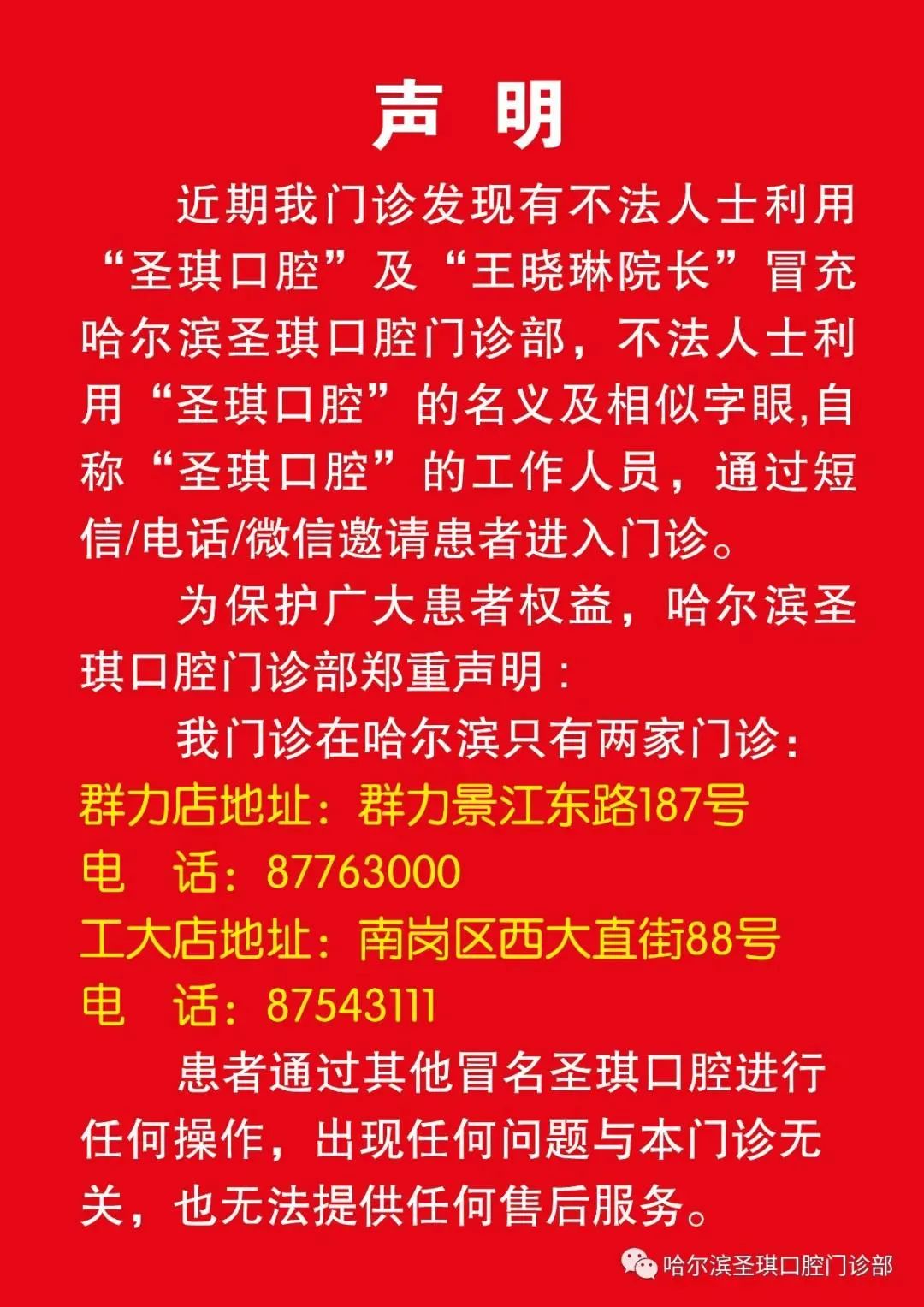 为保护广大患者权益,哈尔滨圣琪口腔门诊部郑重声明:我门诊在哈尔滨只有两家门诊: