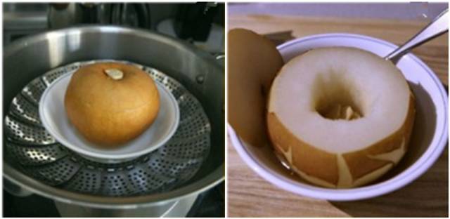 将整个梨放在碗中,搁在蒸笼上,在沸水中蒸20分钟;