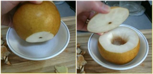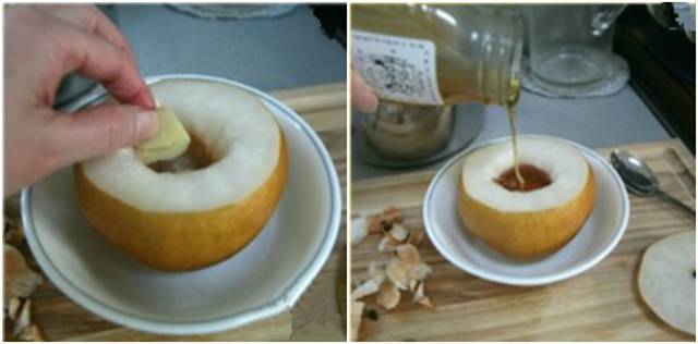 在梨的中心放上姜片和冰糖,倒入蜂蜜后,把盖子盖上;