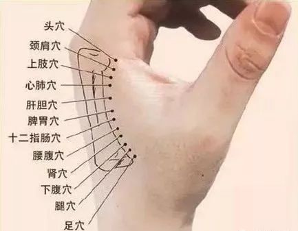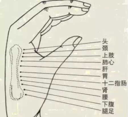 这种人自己就能说出他身上的好多毛病来。遇到这类人时,你不要管他现在哪个病重,哪个病轻,只要去调理他的脾胃,告诉他不仅要安排好营养丰富的一日三餐,还要将食物尽量做的软、细、烂,以便于消化吸收,并嘱咐他每天晚上临睡前要用热水泡脚,以增加血液循环,并通过饮食及时地补足血液。这种人千万别让他多锻炼身体,散散步就可以了。另外,在睡觉前做一些利于睡眠的简单按摩,如耳部按摩、梳头、拍肩等,对身体虚弱的人很实用。时间一长,血补足了,睡眠好了。许多的毛病都会在不知不觉中慢慢地消失。并没有单独去治哪个病,可是整体提高了身体素质,增强了抵抗力。不过,这种人身体不适的消失只是暂时的,他的身体底子差,只有靠每天的精心照顾和维护,才能不生病。但是只要将有利于身体的饮食和按摩常年坚持下去,他同样能够健康地过好每一天,活到百岁。如果骨头摸上去还算清晰,但仍会摸到一处或几处的凸起,这时根据第二掌骨图中所标明的位置去找相对应的脏器。如头穴与足穴连线的中点为胃穴;胃穴与头穴连线的中点为肺心穴;肺心穴与头穴的连线分三等分,从头穴端算起的中间两个分点依次是颈穴和上肢穴;肺心穴与胃穴连线的中点为肝穴;胃穴与足穴的连线分为六等份,从胃穴端算起的五个分点依次是十二指肠穴、肾穴、腰穴、下腹穴、腿穴。