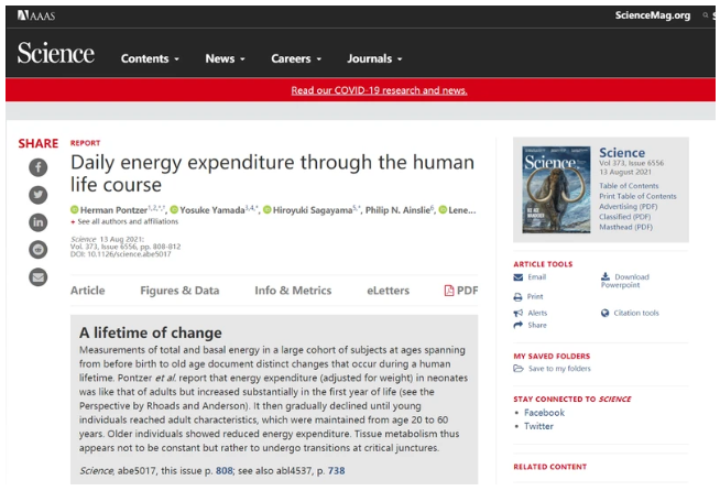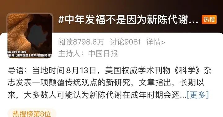 当地时间8月13日,美国权威学术刊物《科学》杂志发表一项颠覆传统观点的新研究,文章指出,长期以来,大多数人可能认为新陈代谢在成年时期会逐渐减弱,人的体重也因为年龄增长,新陈代谢速度放缓而增加。实际上,这一观念是错的。