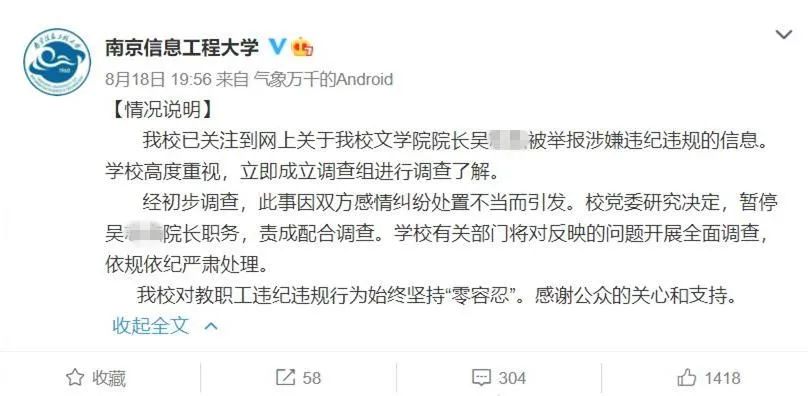 8 月 18 日晚,@南京信息工程大学 官方微博针对此事,发布《情况说明》称,学校已关注到网上关于文学院院长吴某某被举报涉嫌违纪违规的信息。学校高度重视,立即成立调查组进行调查了解。该《说明》提到,经初步调查,此事因双方感情纠纷处置不当而引发。校党委研究决定,暂停吴某某院长职务,责成配合调查。学校有关部门将对反映的问题开展全面调查,依规依纪严肃处理。