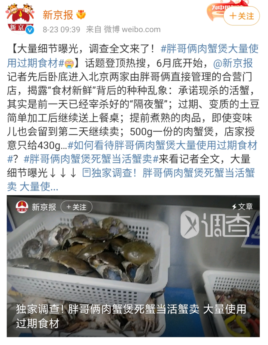 就在昨天,在全国开有400多家分店的知名网红餐厅“胖哥俩肉蟹煲”出事了!