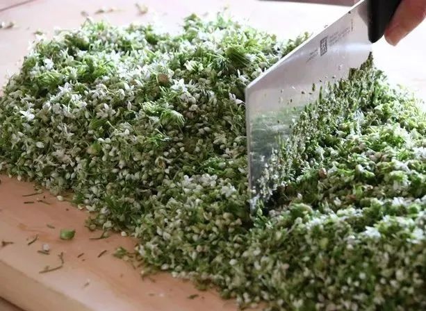 韭菜花晾干后,放在案板上,用菜刀将其剁碎。用搅拌机搅打韭菜花看起来是省力一些,但搅打成泥的韭菜花一点口感也没有了,香味都会变淡,而用刀剁出来的韭菜花特别香,吃起来还有些许的颗粒感,比泥状的韭菜花酱好吃很多!