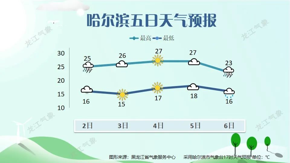 2日白天最高气温:大兴安岭、齐齐哈尔、绥化22~24℃,其它地区24~26℃。
