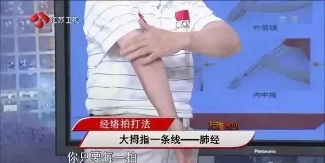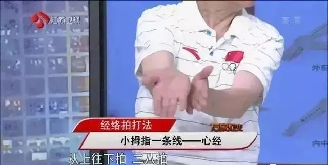 肺经:从肩到大拇指一条线,从上往下均匀地拍打二八拍,一共拍四次。同样手臂反过来从大拇指拍到肩部,也是四个二八拍。心经:从腋窝到小拇指一条线,做四个二八拍;同样手臂反过来从小拇指往上拍四个二八拍。心包经:从手臂中间拍到手掌,四个二八拍;同样手臂反过来,从手掌拍到肩部,四个二八拍。胃经:从正前面拍到外踝骨,四个二八拍;反过来,从外骨踝拍到腹股沟,四个二八拍。