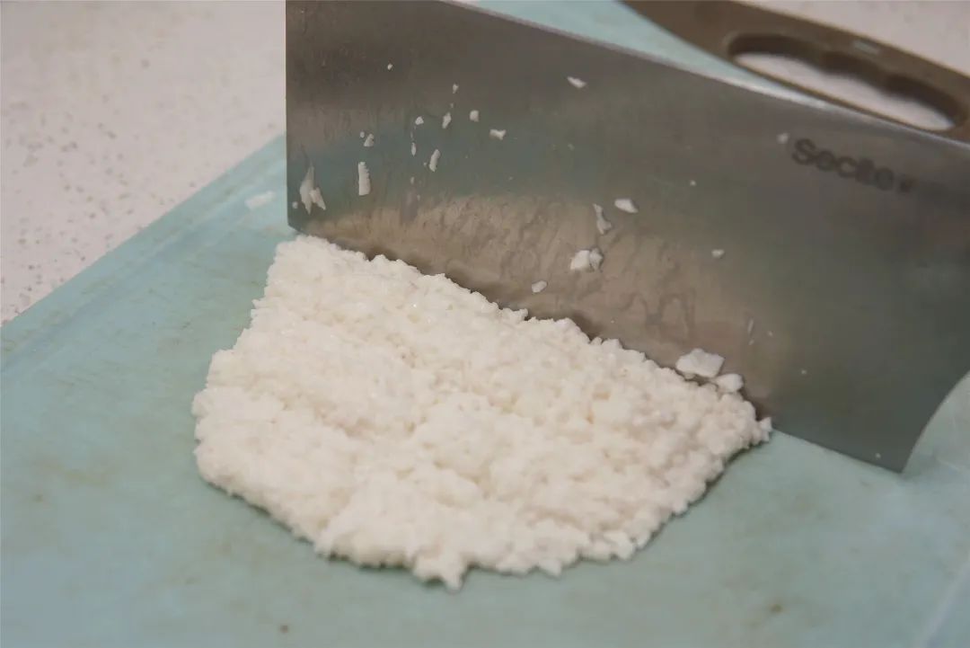 1、山药清洗干净,去皮后放在案板上,用刀背拍扁,剁成带有颗粒感的泥状,山药剁成泥煮汤会更浓稠细腻,也更容易消化吸收。