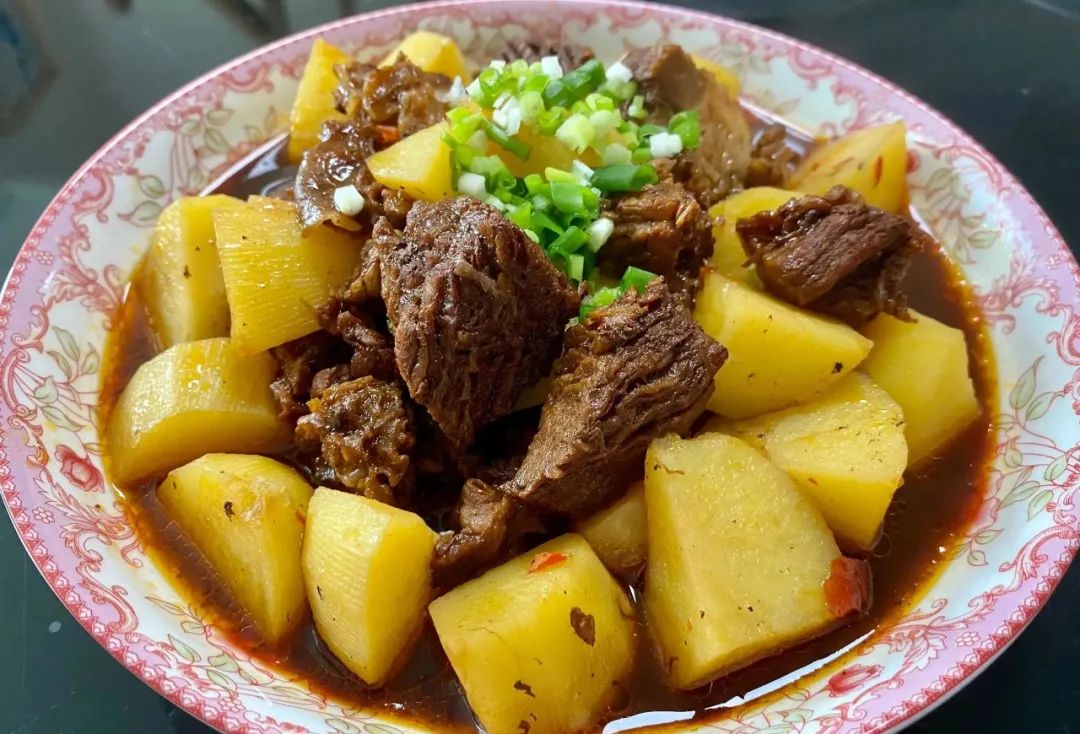 4,牛肉炖好以后,取一部分牛肉,把大块改成小块,和土豆一起放入锅中,倒入牛肉汤,加一勺豆瓣酱,等土豆炖烂以后,洒上小葱增香,加味精,起锅装盘。