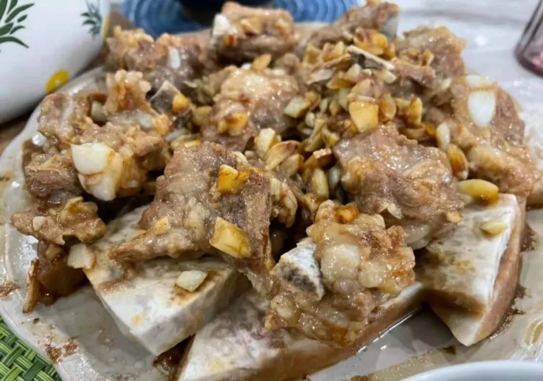 4、芋头去皮洗净,切成小块,放进蒸盘内,再将排骨放在芋头上面。