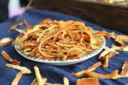 把橘皮洗净晾干,与茶叶一起泡水喝,也可单独泡水喝,味清香,可提神、通气。做菜时也可以放几片,解腻开胃。