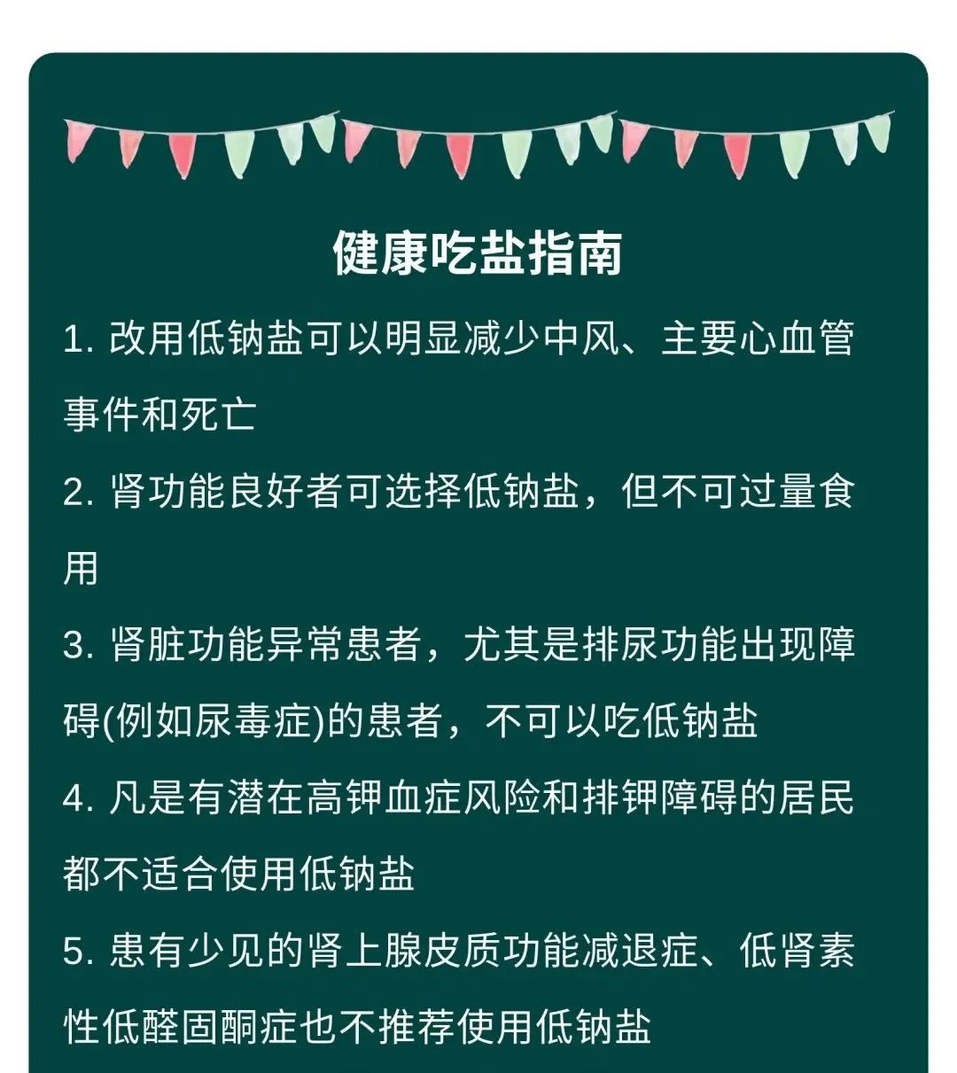 《中国居民膳食指南(2016版)》推荐每日摄入盐需少于6克。在我国的高血压防治指南中也明确指出,肾功能良好者可选择低钠富钾替代盐。但千万不可因为低钠盐有好处就大把大把地用,否则就失去了减盐(低钠)的意义了。