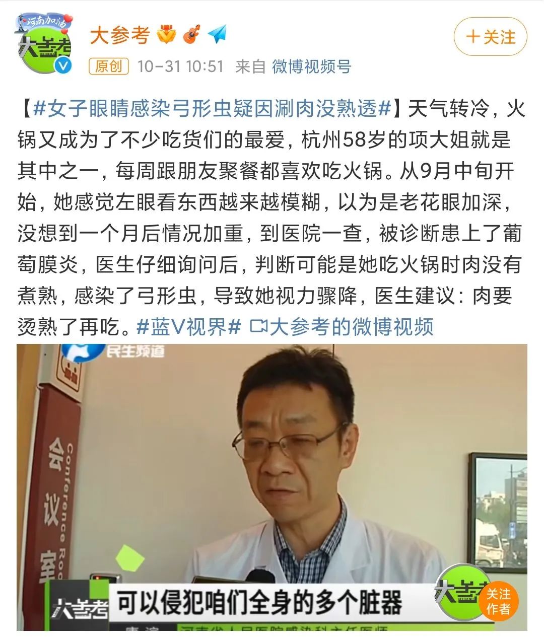 在涮肉时为了贪那一口“嫰”,不少人把肉“烫”一下就入口,并没有完全熟透的食物,给了寄生虫钻空子的机会。