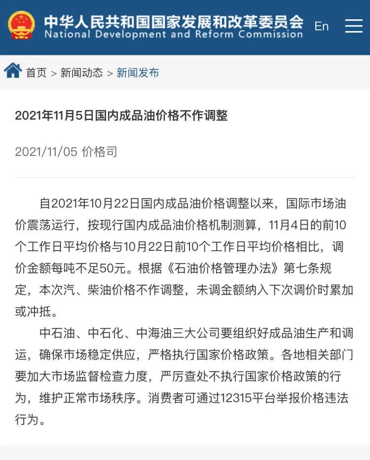 今天,国家发改委宣布,新一轮成品油调价窗口将于今天(11月5日)24时开启。按现行国内成品油价格机制测算,调价金额每吨不足50元,本次汽、柴油价格不作调整,未调金额纳入下次调价时累加或冲抵。