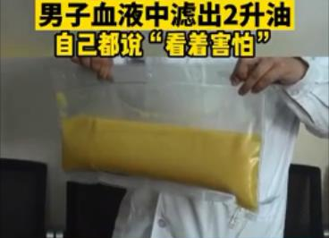 据极目新闻报道,11月15日,武汉的王先生在武大中南医院就诊时,医生在其血液中透析出了2升油浆,交由当事人过目后,王先生连呼“害怕”!