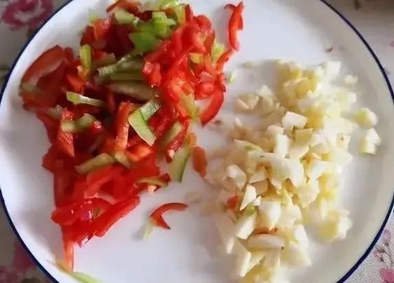 2.红绿辣椒切末备用,大蒜去皮切末,