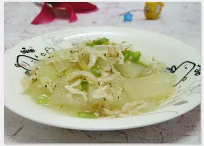 4、加小半碗水,加少许盐,大火烧冬瓜微烂后倒入虾皮,混炒后撒些葱花即可上桌。