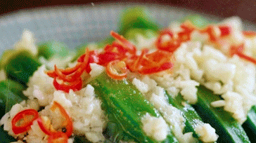 3、将作法2的淋酱淋在作法1的秋葵上就完成啦!