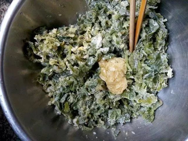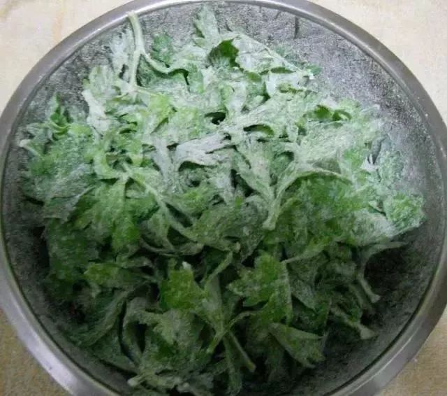 (1)芹菜叶洗净用筛子晾至不滴水、先加一小勺玉米油拌匀(蒸的时候保持绿色)再加面粉拌匀;