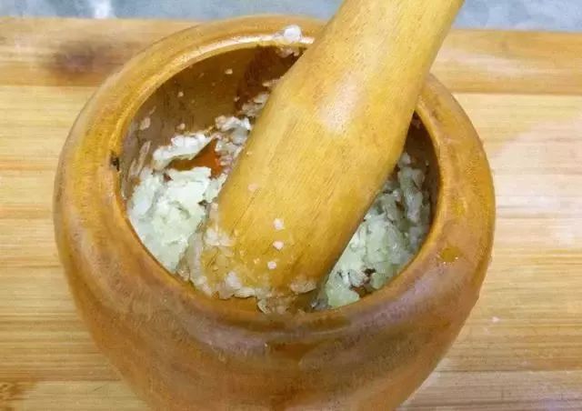 (3)蒜、盐、味精、白砂糖放入石臼杵成泥;