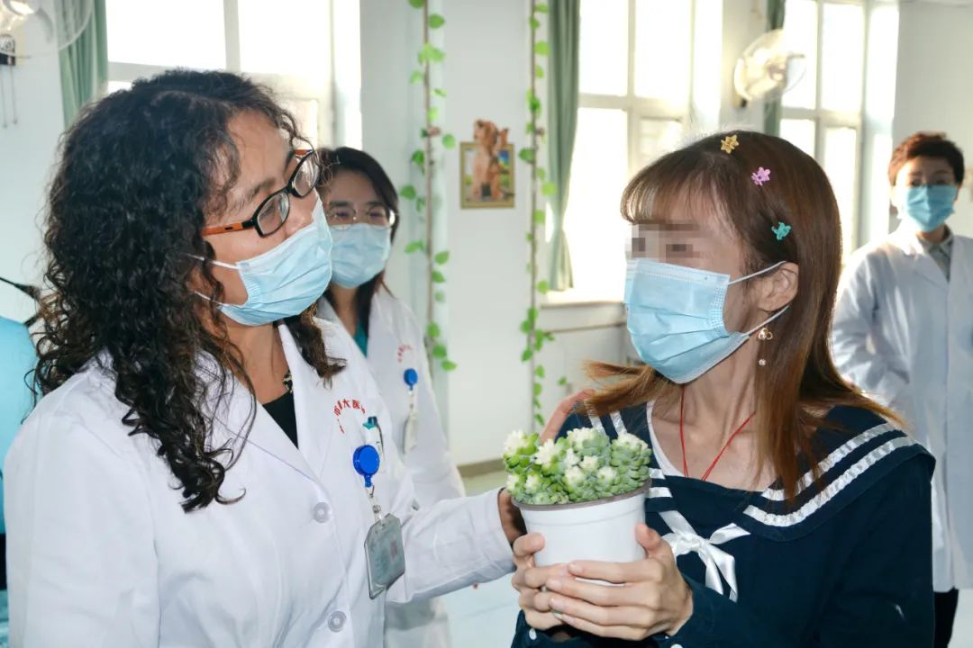 高兴地看见琳琳体重增长到30公斤,彭新贤主任和张亚东医生也兑现了当初的承诺,送给她一份小礼物——一盆生机勃勃的小绿植。