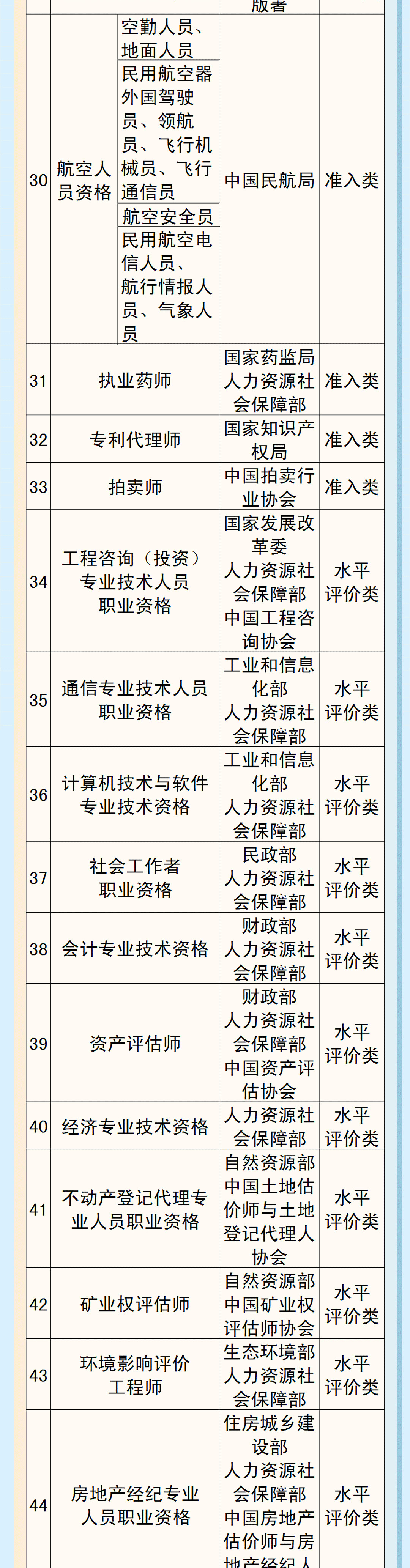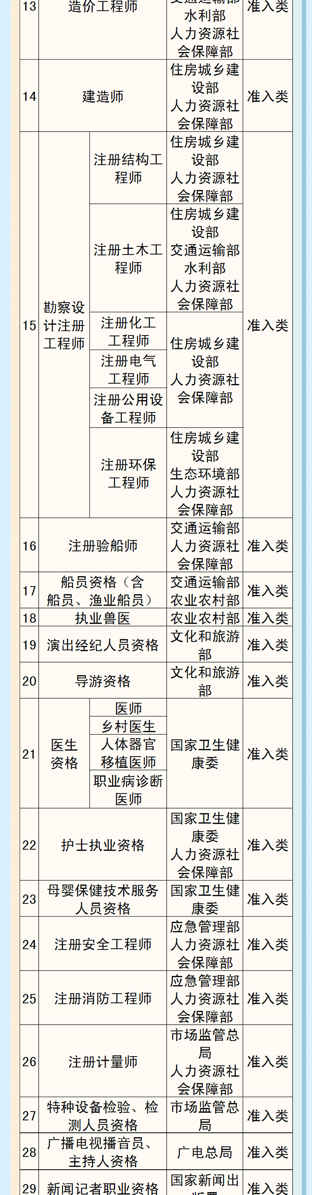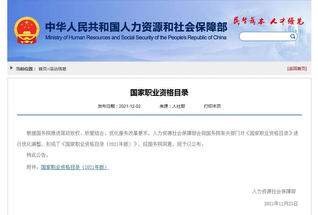 优化后的《目录》包含72项职业资格,其中,专业技术人员59项(准入类33项,水平评价类26项),技能人员13项。职业资格总量比2017年目录减少68项,压减比例达49%。也就是说,新版目录大约压减了一半。这对于进一步提高职业资格设置管理科学化、规范化水平,推动降低就业创业门槛,优化就业创业环境,持续激发市场主体活力和社会创造力,推动高质量发展具有重要意义。在专业技术人员职业资格方面,“出入境检疫处理人员资格”、“乡村兽医资格”和勘察设计注册工程师下的“注册石油天然气工程师”“注册冶金工程师”“注册采矿/矿物工程师”“注册机械工程师”退出目录,从业人员依据行业标准开展技术活动。在技能人员职业资格方面,水平评价类技能人员职业资格退出国家职业资格目录。除与公共安全、人身健康等密切相关的职业工种外,73项水平评价类技能人员职业资格全部退出目录,不再由政府或其授权的单位认定发证。还有就是,人社部门退出技能人员职业资格具体实施工作。在新版国家职业资格目录中,人社部门已不再承担技能人员职业资格具体实施工作。在专业技术人员职业资格方面,新增“精算师”“矿业权评估师”水平评价类职业资格,在医生资格下设置“职业病诊断医师”子项。新增职业资格项目均具有较强的专业性和社会通用性,技术技能要求较高,行业管理和人才队伍建设确实需要。在技能人员职业资格方面,涉及人员资格的行政许可事项作为准入类技能人员职业资格纳入目录,新增了“危险货物、化学品运输从业人员”“道路运输从业人员”“特种作业人员”“建筑施工特种作业人员”“特种设备安全管理和作业人员”等准入类职业资格。